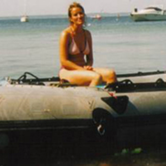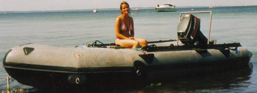 BÅD: 7-8 lapper ca. 13x7 cm i gråt gummi, bøjle i rustfrit stål med lanterne (kan tages af), aluminiumsdørk, hul Ø 4 cm i højre side af hækbræt, oppustelig køl, slidt.